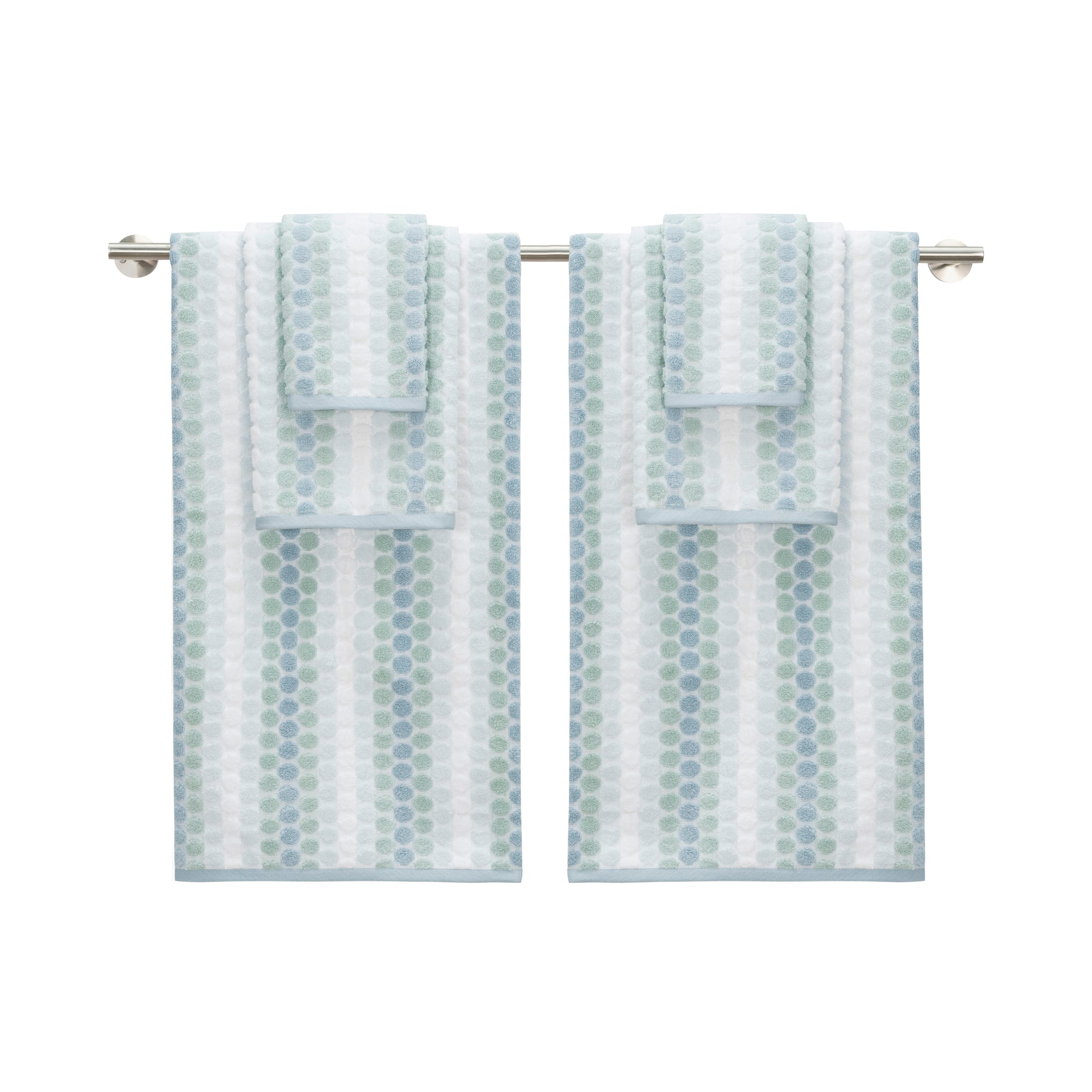 Soft under the hands, generous against the skin, and easy to live with. The design features vertical dotted stripes in layered aquatic tones that feel fresh and relaxed, never loud. This 6-piece set includes 2 bath towels, 2 hand towels, and 2 tip towels, all in the Aquatic colorway.